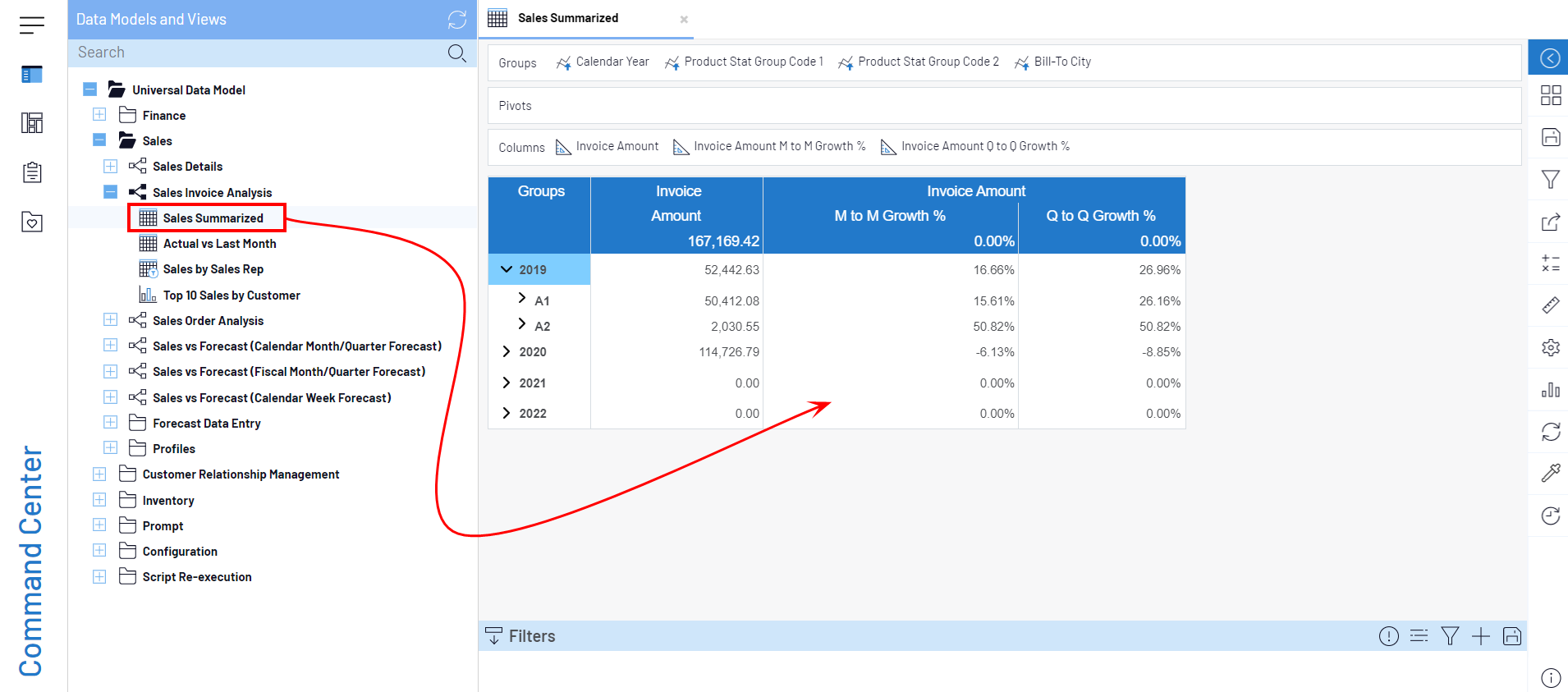 Using the measures Invoiced Amount, Invoice Amount M to M Growth in % and the Product Stat Group Code dimensions , we can quickly analyze the sales performance by product type. For more details regarding the origin of the Dimensions by ERP, please refer to the specific section on source systems in the Sales module.