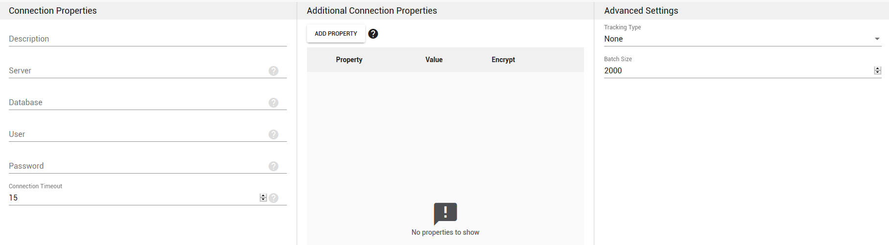 To complete the creation of your connection, you will need to fill out the fields of these 3 following panels: Connection Properties, Additional Connection Properties and Advanced Settings.![]()