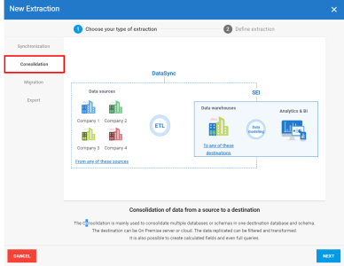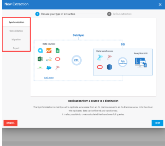 • Synchronization: consists of replicating tables from a source connection to the tables of a destination connection.
