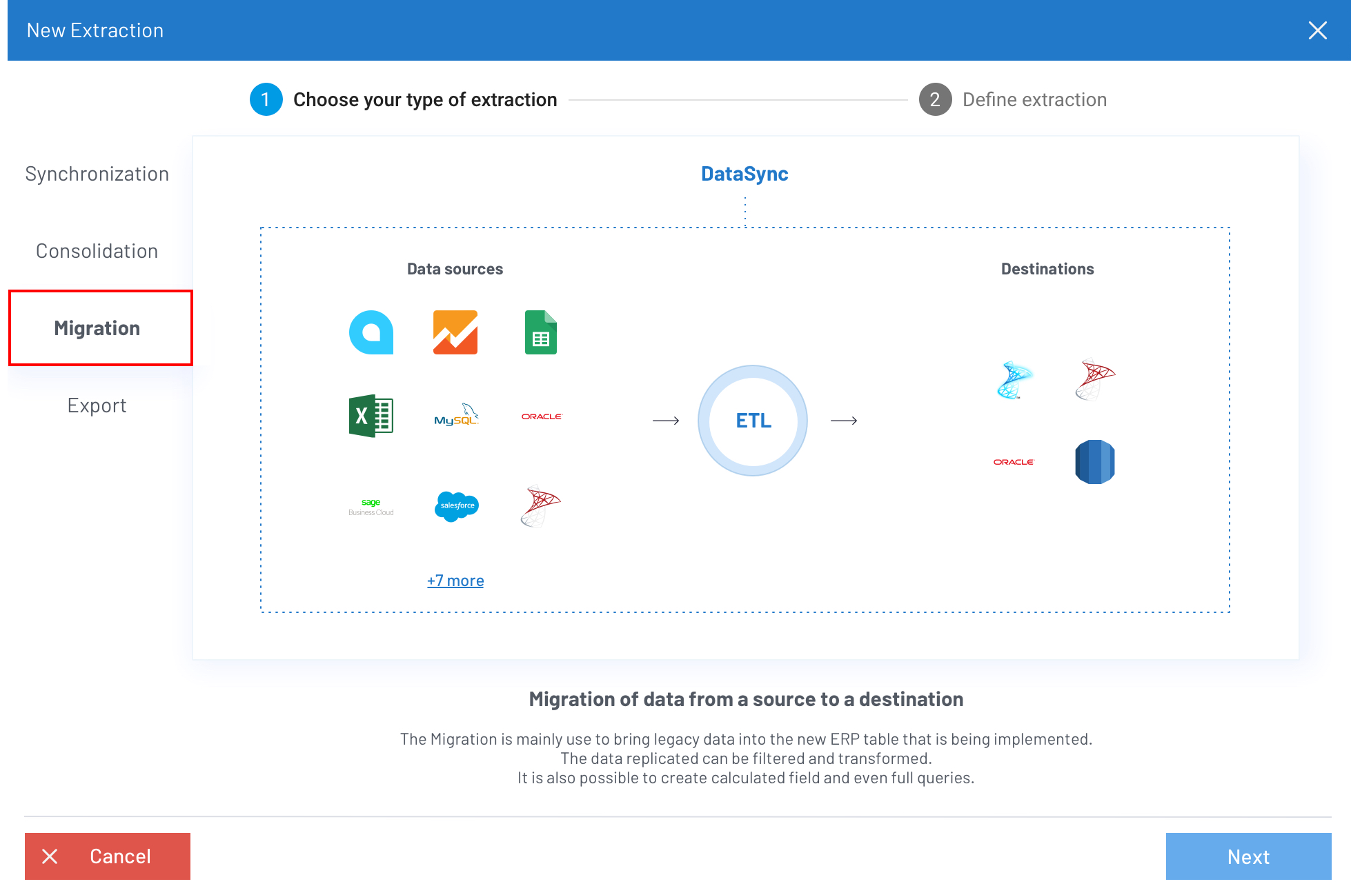 • Migration: consists of moving data from a source to an existing destination (a license is required to get access to this feature).