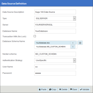 - SQL User accessing the Sage 100 North America database. For example, sa.