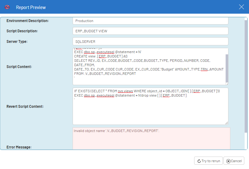 will be displayed. Click on the fail symbol to view the Report Preview window, which shows the respective SQL script.