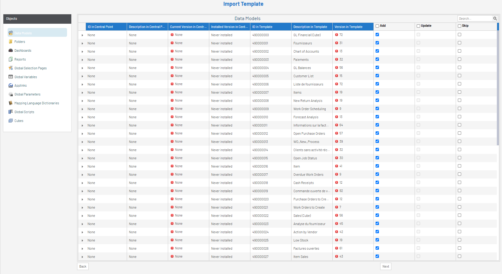 ImportantIf you tick the Update checkbox, it will overwrite the existing SEI objects associated with that Data Model or connected to the others (dependencies). Please note that if any customizations have been done, they will be lost.