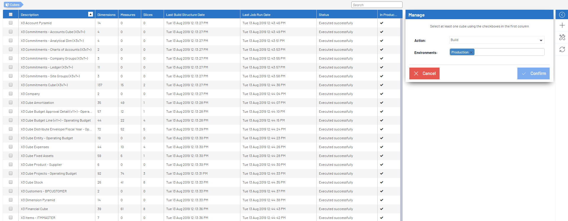 - In the left section, select all the Cubes to build by ticking the checkbox next to the Description column.