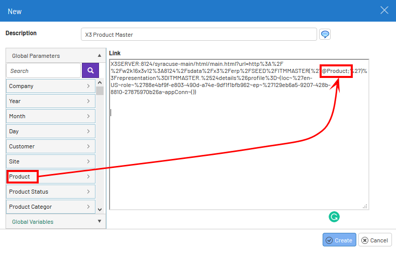 Drag and drop of Global Parameters or Global Variables will add the appropriate code at the end of the link.