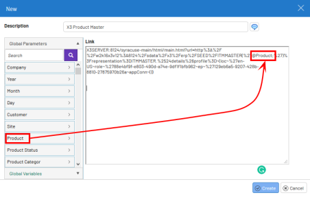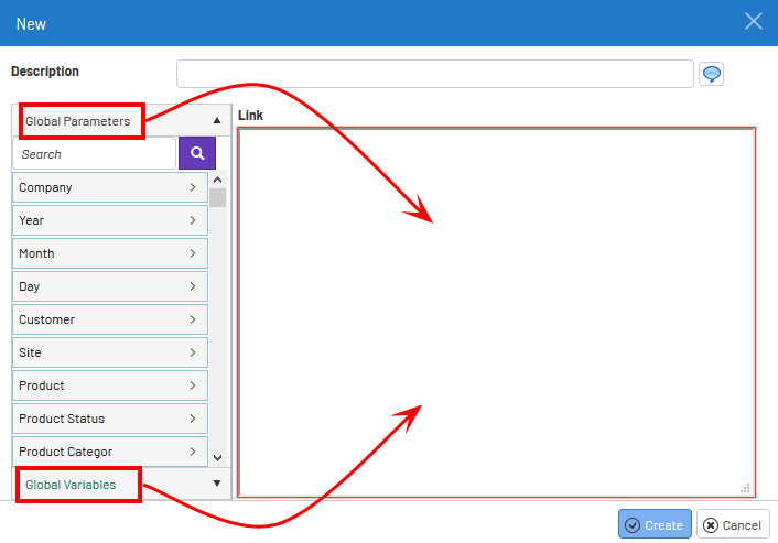 - These can be dragged into the Link field to help configure the link expression dynamically based on the values of the global variables.