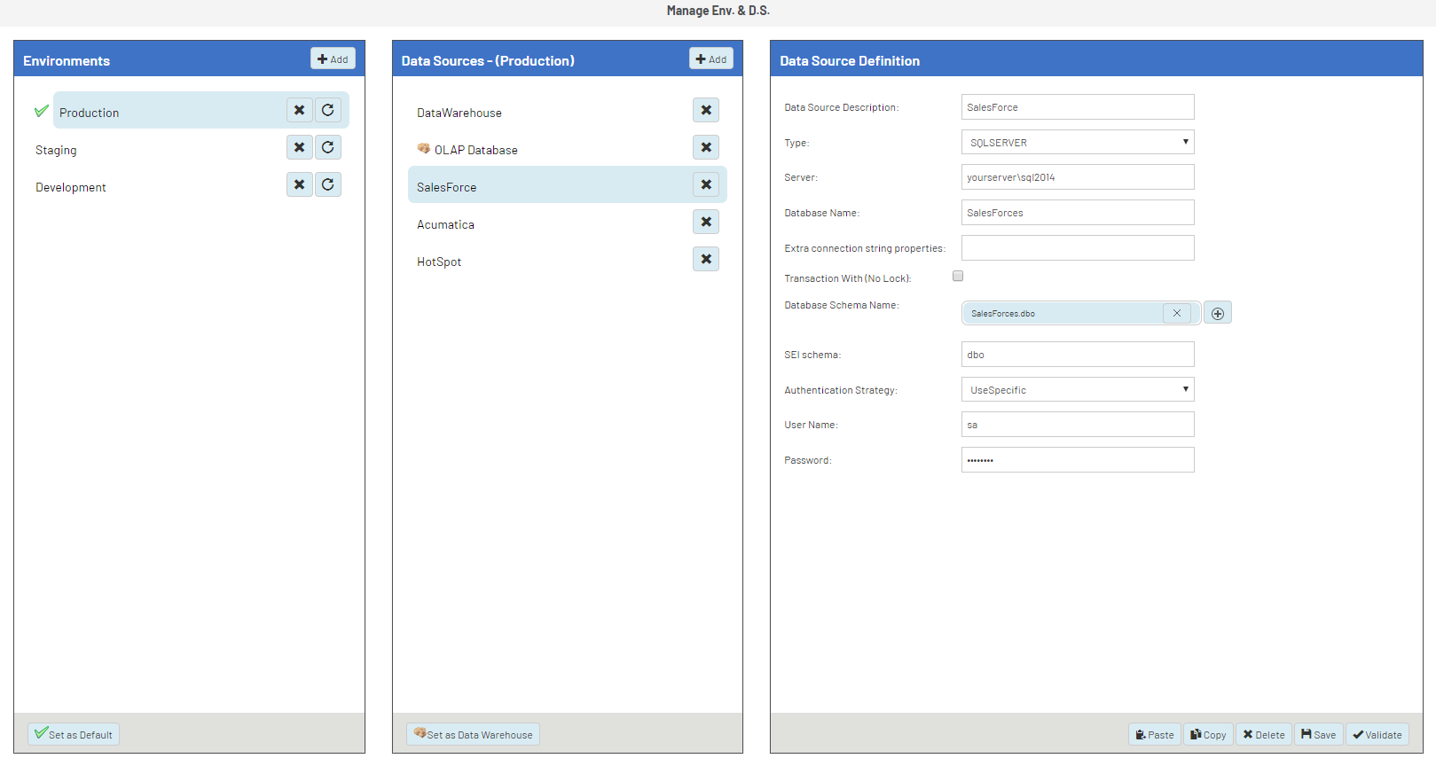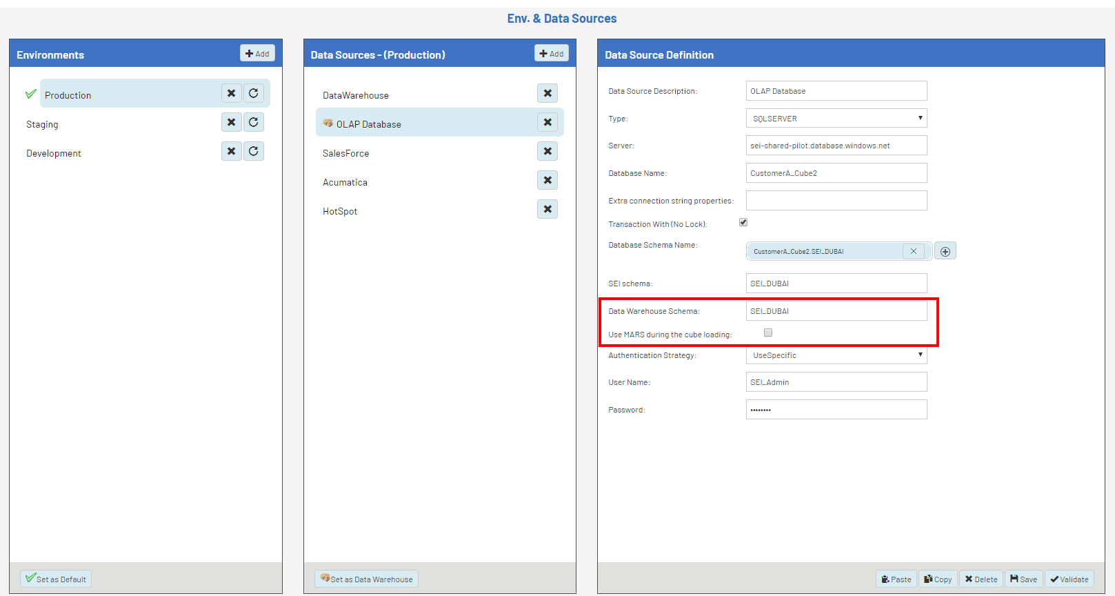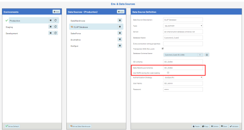 - Set a data source as warehouse, so it is used to build the cubes. Only one data source can be set as data warehouse.