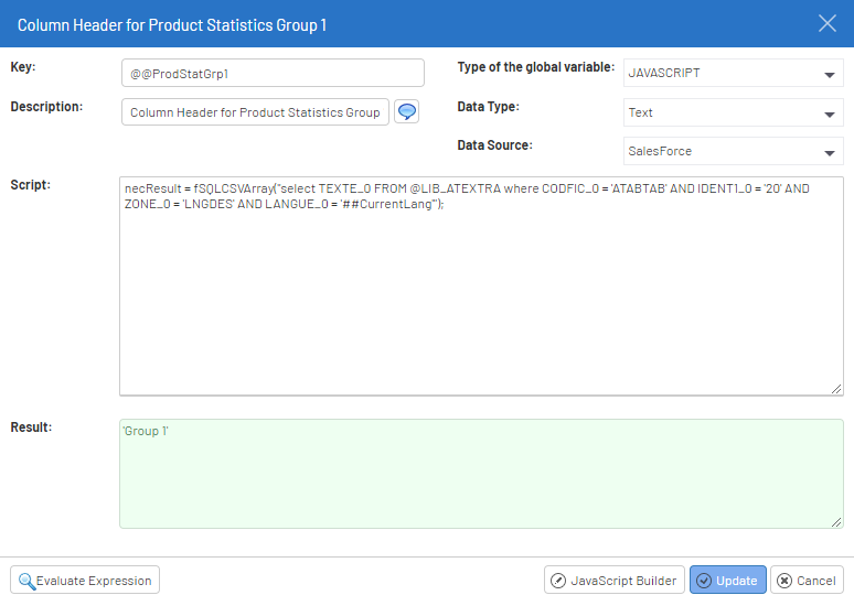 - When selecting JAVASCRIPT in the Type of the global variable drop-down list, the window layout will change to enter more information.