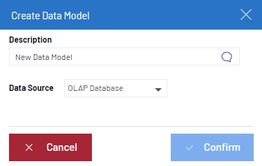 - In the Description field, enter the Data Model name and select the associated Data Source in the drop-down list (refer to Environments and Data Sources for more details).Note