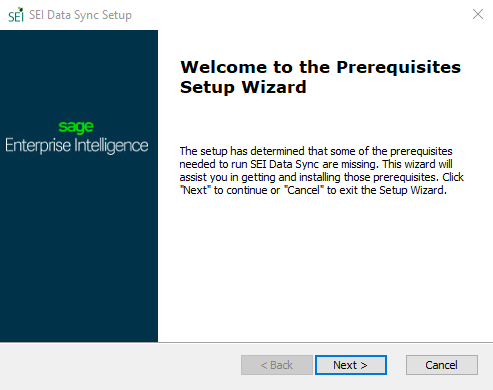 - Install the missing prerequisites then get back to the SEI DataSync wizard.
