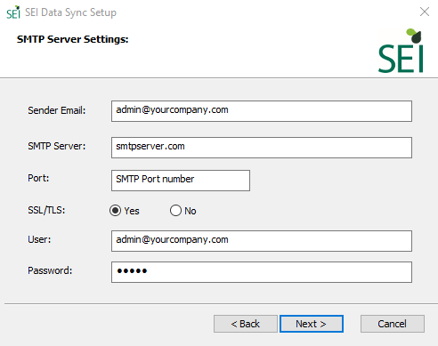 - The SMTP Server is your company’s SMTP server, which will be used to relay automatic emails generated by SEI DataSync during the user creation and password reset as well for example.