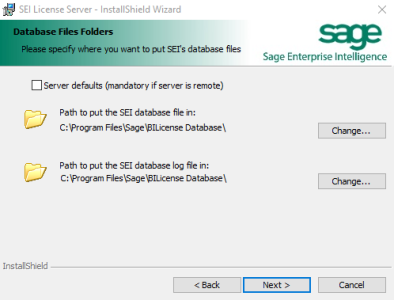 - When the Server Defaults checkbox is ticked, it indicates that there are already BI License database files in the Server Default location that must be deleted.