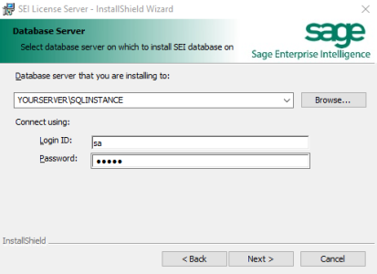 - Enter the Administrator credentials of the database server (for more information about SQL Server, refer to SQL Server Authentification).