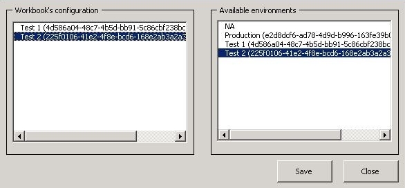 - Tout environnement défini dans l'outil Configuration des Références sera disponible dans la section Configuration du Classeur (section de gauche) de la fenêtre Configurations des Environnements.