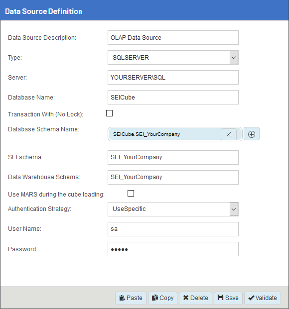 | Server | Database server where the SEIOLAP For SQL Server package is installed. |