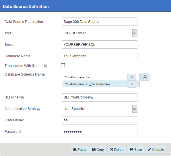 | Database Name | Name of the Sage 300 database (beware of the case sensitivity) |