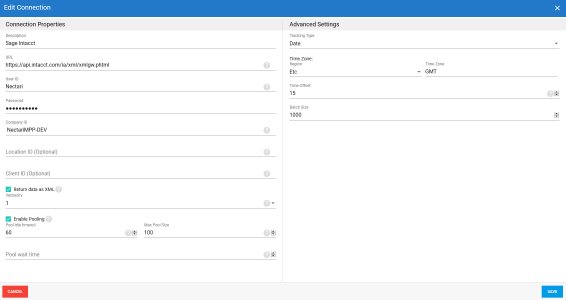 - For the User ID, Password and Company ID fields, enter the credentials you received in the email from Sage Intacct.