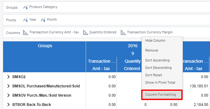 Dans la section Colonnes, cliquez droit sur l'élément désiré (Dimension / Description / Mesure) et sélectionnez Formatage de colonne.