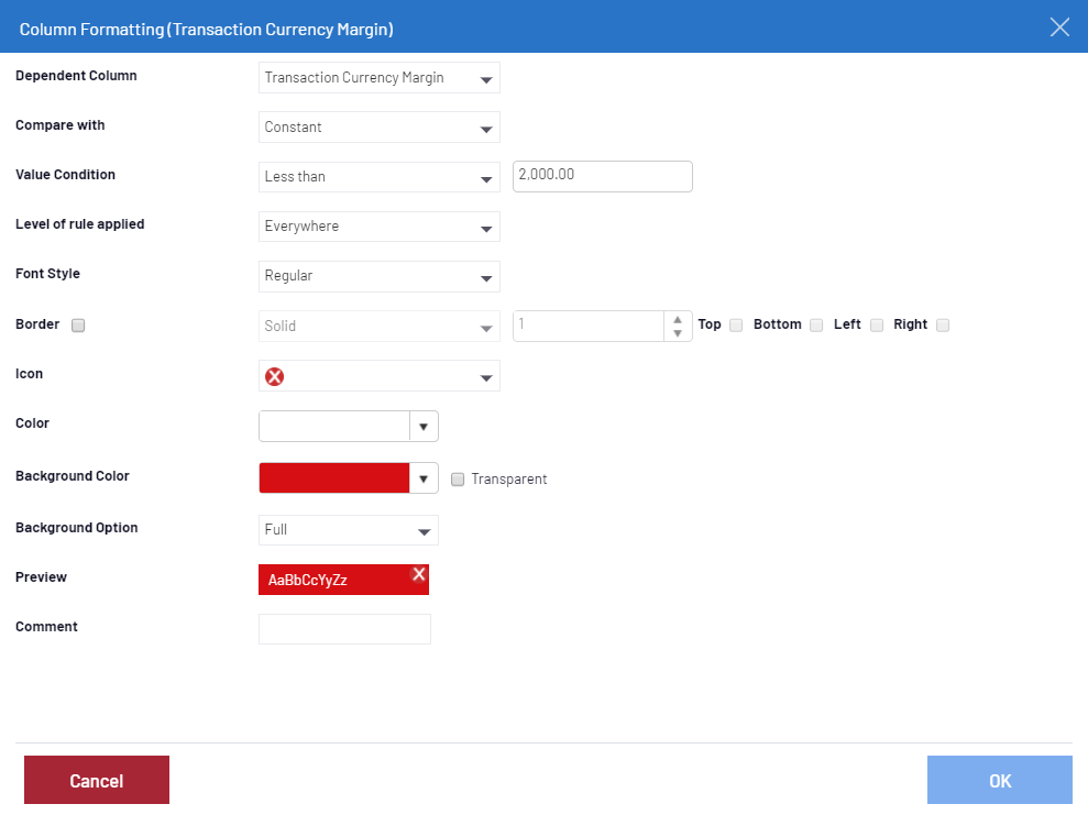 Paramètre Description Colonne dépendante Définit la colonne sur laquelle la condition sera testée. Il est possible de sélectionner Groupe comme colonne dépendante ; si c'est le cas, la condition sera testée par rapport au code de groupe. Condition de la valeur La condition utilisée pour tester si le format sera appliqué. Niveau de règle appliquée Sélectionnez les niveaux totaux et les niveaux de détail où le formatage sera appliqué.