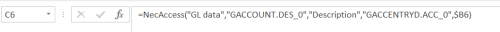 Here, we display the Account Description for the Account Code contained in the $B6 cell. See the setup for the formula below.