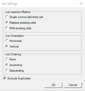 - To return the list of values for the selected field. The output is a comma delimited cell sorted in ascending order. The difference with the other list option is that this list will update as any Excel formula when the parameters are changed.