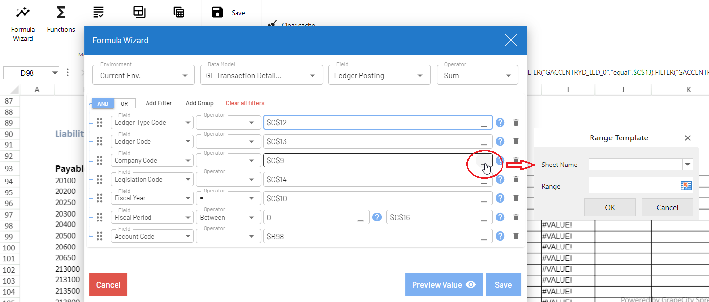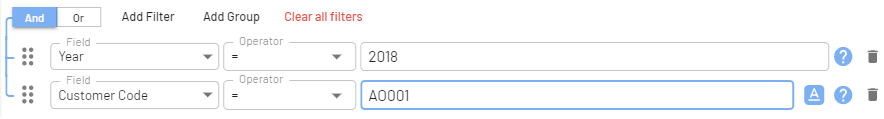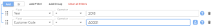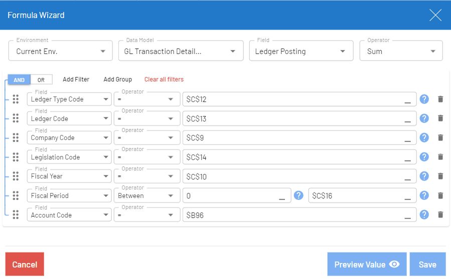 Click Add Filter to add filters to the formula. Filters can be grouped using Add Group and can be set between an OR and AND. For formula examples, see Workbook Formula Examples .