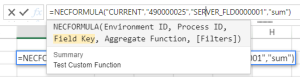 The workbook generates a function that is visible in the formula bar. When clicking the formula bar, it displays a pop-up that shows the NECFORMULA function (similar to the NECACCESS function in the Excel Add-in).