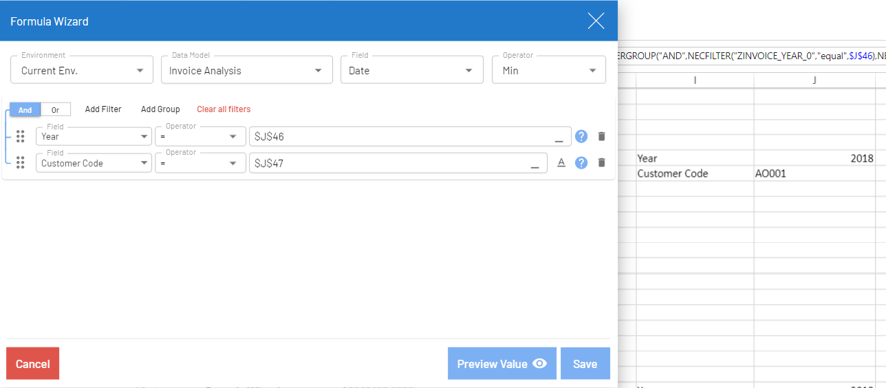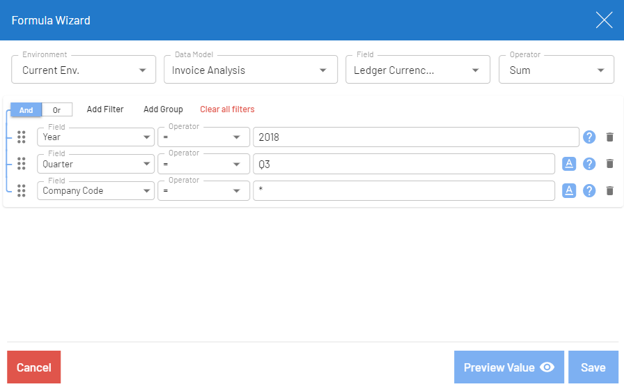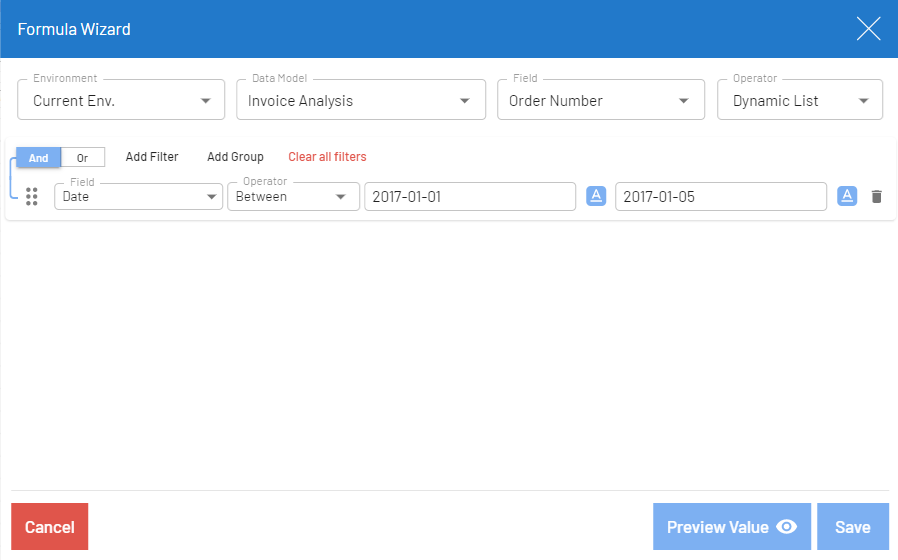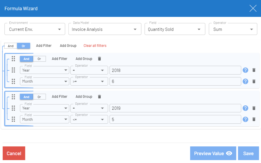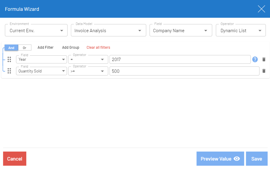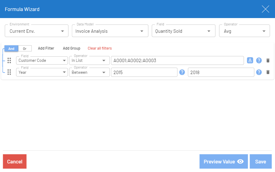 This topic provides examples of formulas created with the formula wizard. The examples are based on the Invoice Analysis data model.