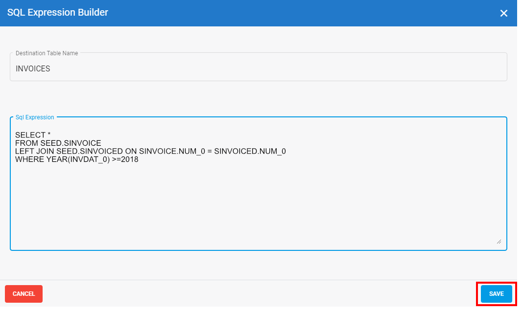 In the SQL Expression text box, enter the SQL statement and click Save.
