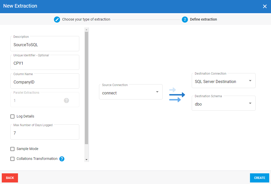 When you create an extraction, the New Extraction panel will show up for you to specify which source and destination connections should be used to perform the extraction.![]()