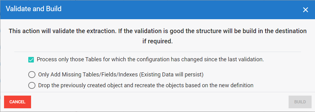 Process only those tables for which the configuration has changed since the last validation: This option is selected by default. It will only affect modified objects.
