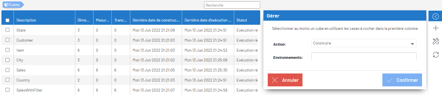Dans la liste des Cubes, sélectionnez les cubes en cochant leurs cases.