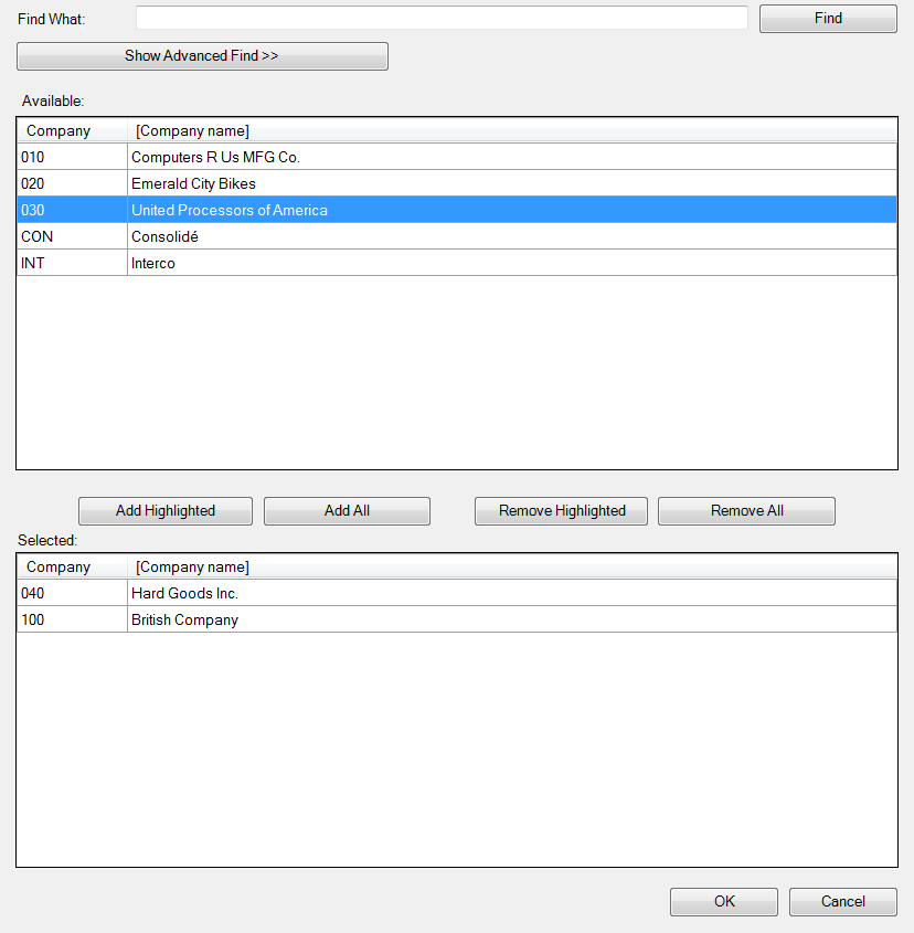 Move items from the Available list into the Selected list using the Add Highlighted button. Sort, Search and Filter capabilities that have been provided to help with this Data Model.