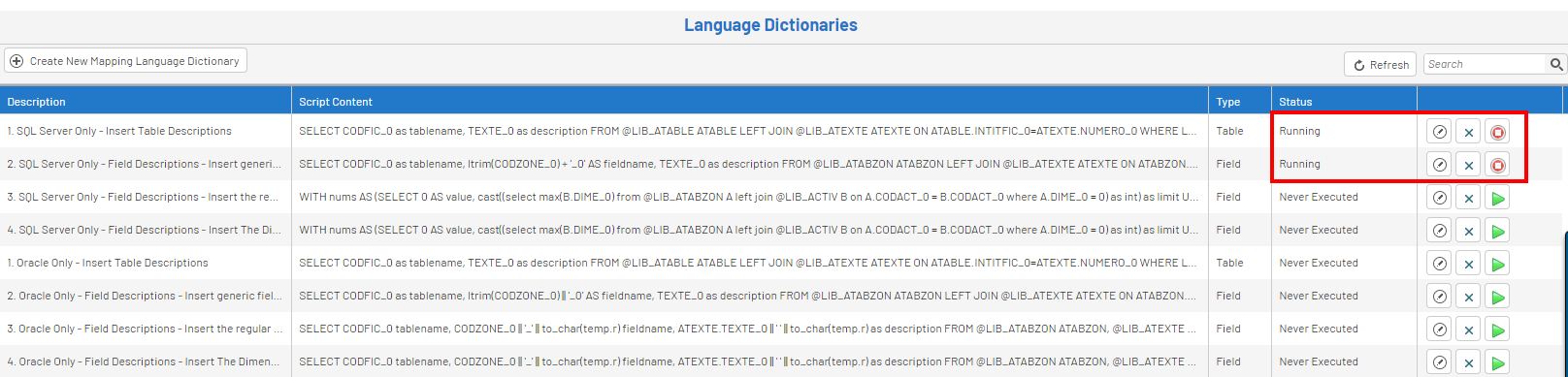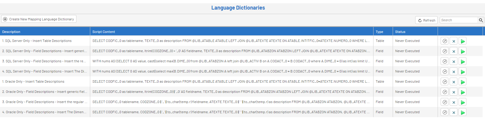 The Language Dictionaries window will display all the scripts already created, and allow the user to Edit, Delete or Run a script.