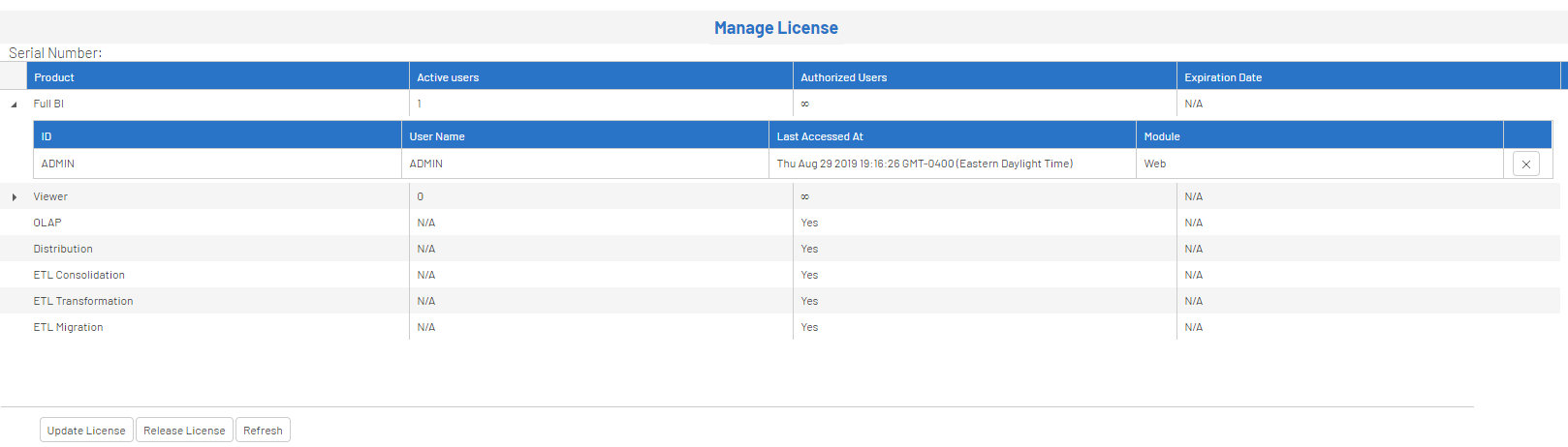 The Manage License option displays all the information related to the current license. It also displays the number of users actually using the software.