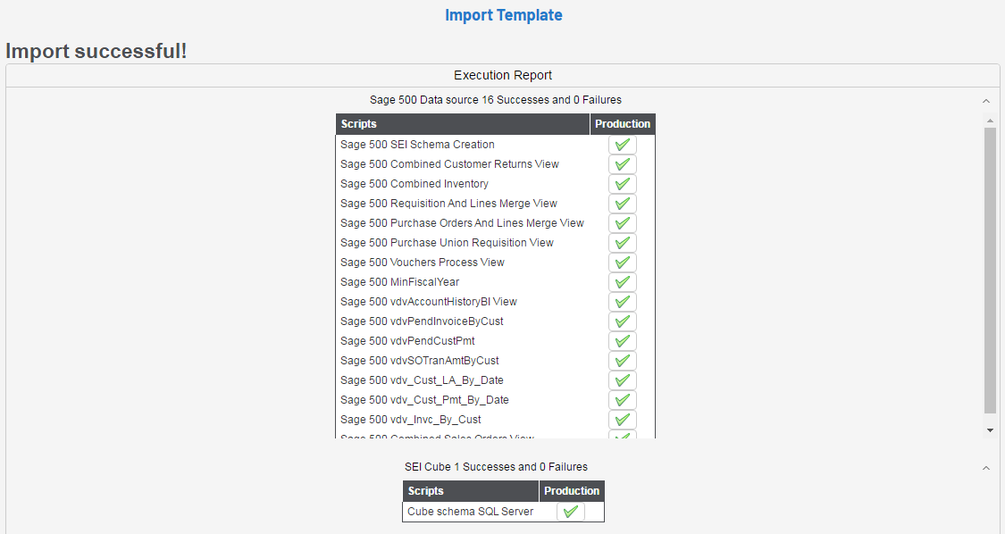After importing, an execution report will be produced. The first section is for the ERP data source and the one below it is for the Cube data source.