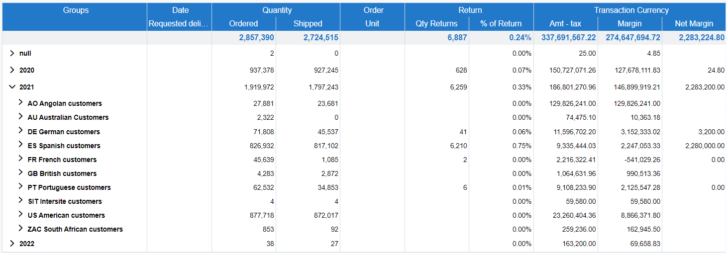 Sales Forecast by Month Forecast vs Actual (Month to Month) Sales Map USA United States Bill to Customers Top 5 Products by Returns Top 5 Products by Sales Top 5 Payment Methods Top 5 Product Categories by Sales Top 5 Customers by Quantity Sales Top 5 Countries by Sales Top 5 Sales Rep Top 10 Sales Rep Top 10 Customers by Margin Top 5 Products by Returns Top 5 Customers by Sales Quantity Top 10 Customers by YTD Sales Growth % Bottom 10 Customers by YTD Sales Growth % Monthly Sales progression line Monthly Sales This Year vs Last Year Monthly Sales vs Costs Product Sales by Sales Rep Sales This Year vs Last Year Sales YTD vs LYTD by Customer Sales / Orders / Deliveries / Returns Sales Quantity by Month Spark Line Quarterly Sales Transport Method Products with Negative Margin Deliveries by Country Monthly Actual vs Forecast by Customer Monthly Actual vs Forecast Customer Category Customers with Returns Open Orders by Customer Sales by Customer and Product |