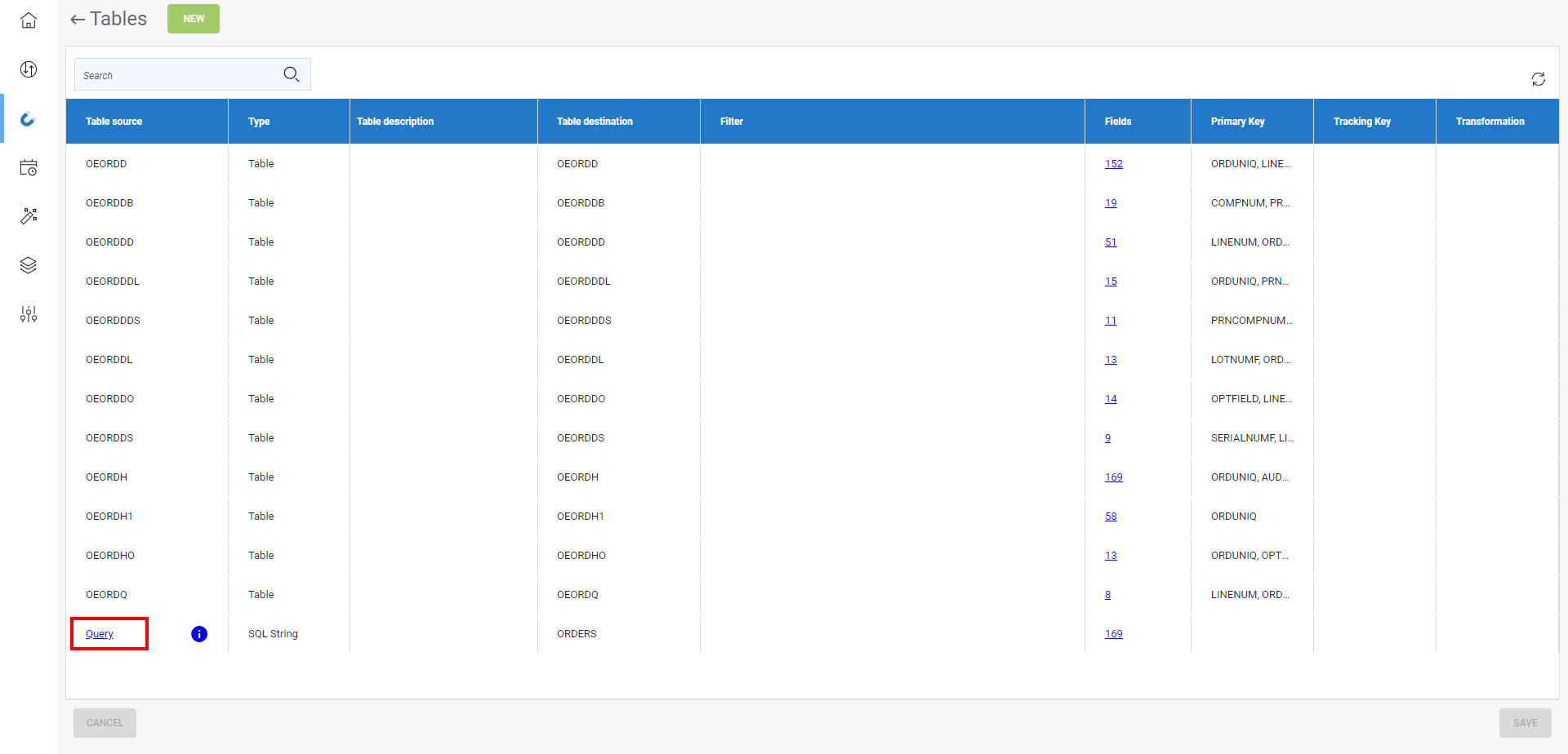 Vous pouvez également accéder à la fenêtre Tables en cliquant sur l'hyperlien dans la colonne Tables de la page Extraction.