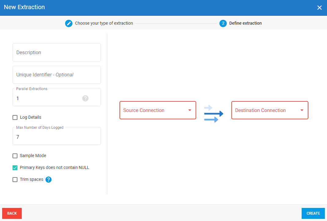 Lorsque que vous créez une extraction, ce panneau s'affiche pour vous permettre de spécifier les connexions source et destination à utiliser pour effectuer l'extraction.
