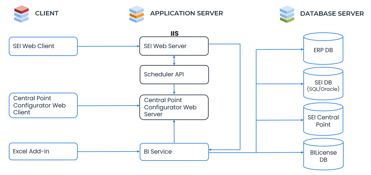 L'application SEI est l'application principale d'intelligence d'affaires. Cette application est responsable de traiter les requêtes venant des navigateurs web et des applications clientes. Certains modules de l'application SEI sont déployés et hébergés sur Microsoft IIS et d'autres modules sont hébergés comme services Windows. L'application peut être installé sur un ou plusieurs serveurs selon le scénario choisi. Reportez-vous à Scénarios d'installation pour déterminer quel type d'installation type s'applique à vous.
