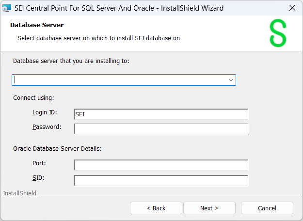 Dans la fenêtre Database Server, indiquez le serveur où la base de données de SEI sera installée et fournissez les informations d'identification requises pour vous connecter à ce serveur puis cliquez sur Next.