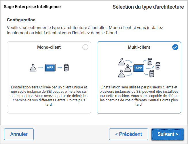 Sélectionnez Multi-client si plusieurs instances de SEI seront installés dans l'écosystème. L'architecture multi-client est recommandée pour les scénarios d'équilibrage de charge dans le cas d'un grand volume de données ou d'un grand nombre de traitements.