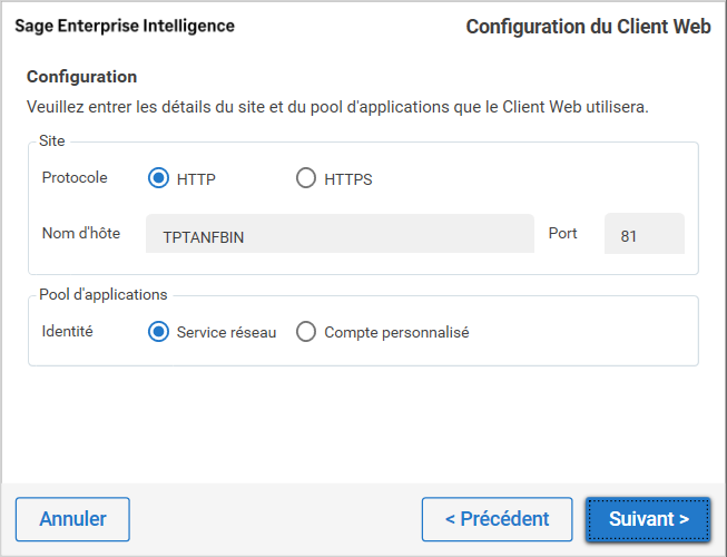 Si vous avez sélectionné le composant Application et/ou le OLAP Worker et/ou le Distribution Worker, l'écran Configuration du Client Web s'affiche :