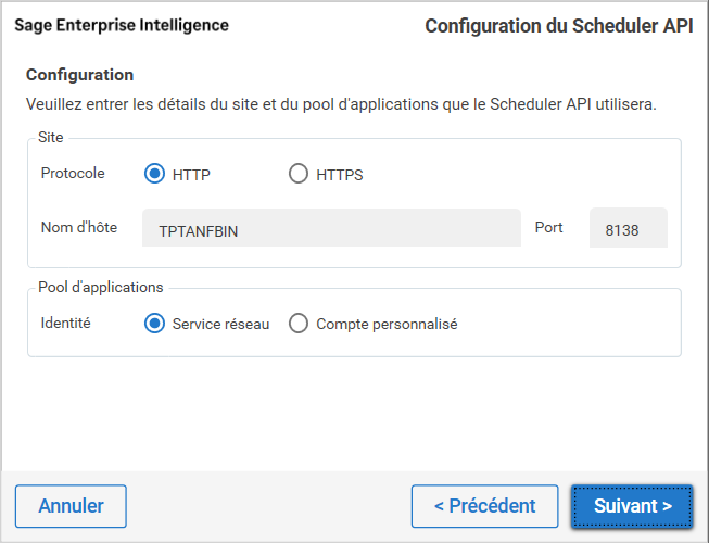 Si vous avez sélectionné le composant Scheduler API, l'écran Configuration du Scheduler API s'affiche. Répétez les étapes mentionnées précédemment pour l'écran Configuration du Client Web.