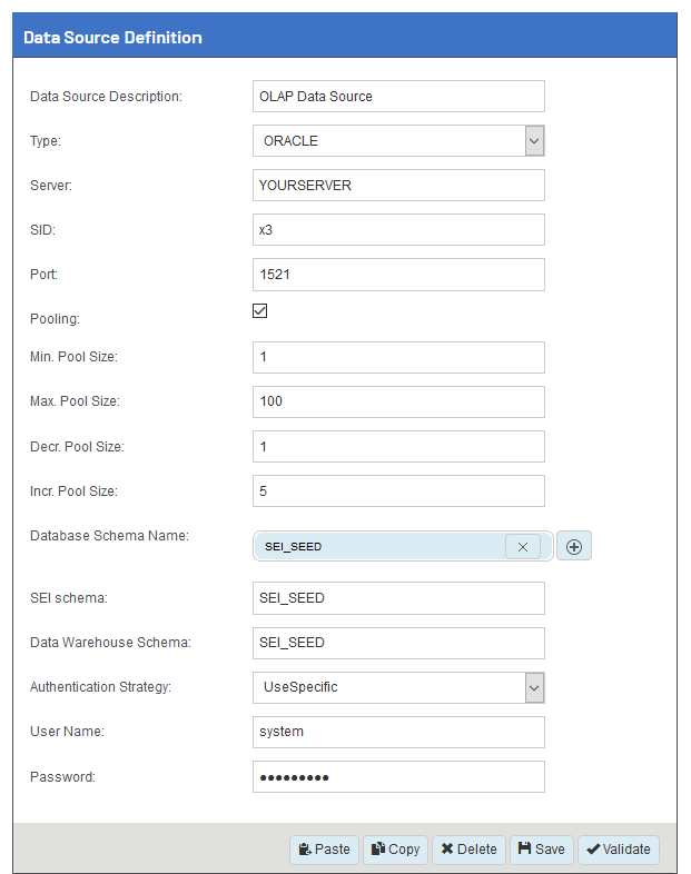Schéma d'entrepôt de base de données Après avoir sauvegardé la source de données et l'avoir définie comme entrepôt de données, saisissez le schéma SEIpersonnalisé choisi pour l'environnement actuel.