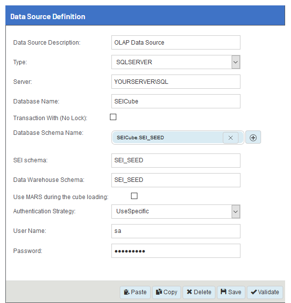 Nom d'utilisateur L'utilisateur SQL qui accède à l'entrepôt de données. Par exemple, sa. C'est le même utilisateur que celui créé dans la rubrique Créer des utilisateurs SQL .