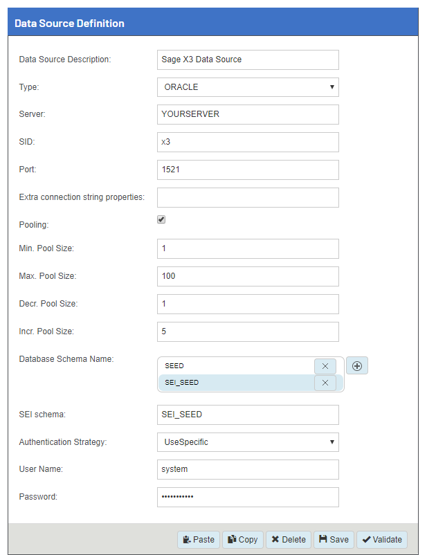 La seconde ligne contient le Custom Schema de SEI. Vous pouvez en utiliser un autre, mais nous vous recommandons fortement de suivre cette convention d'appellation :