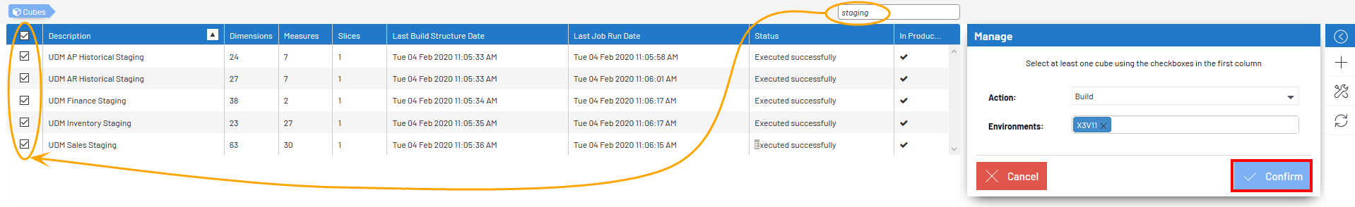 - Dans la liste déroulante Environnements, sélectionnez l'environnement utilisé pour les cubes Staging et cliquez sur Confirmer.