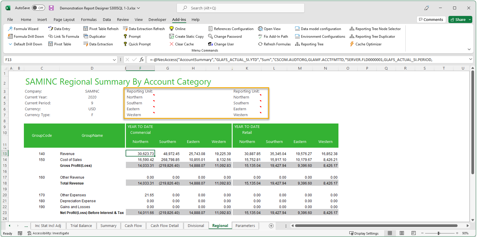You can change cell F11 (Northern) by the tree node itself (the same applies to G11, H11, etc.). This allows you to get rid of the top section and get the same result. All reporting trees are now directly in the report headers. You can click Reporting Tree Node Selector in the menu options to change them directly from the header. The report looks cleaner and gives the same result.