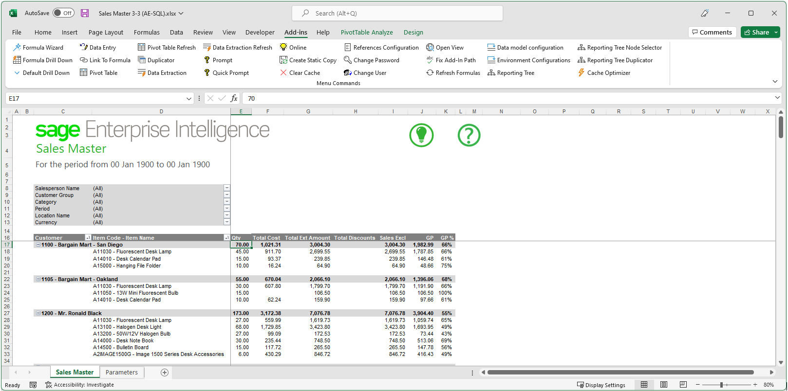 The Sales Master 3-3 (AE-SQL) report is part of the Sage 300 demo reports. This report was created in Sage Intelligence with a simple container with a data dump and a few filters are required to run the reports.